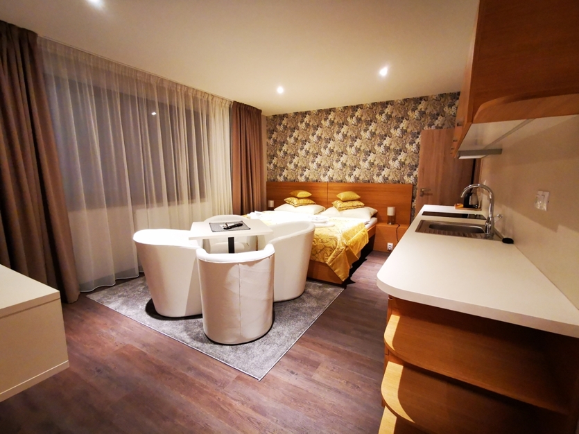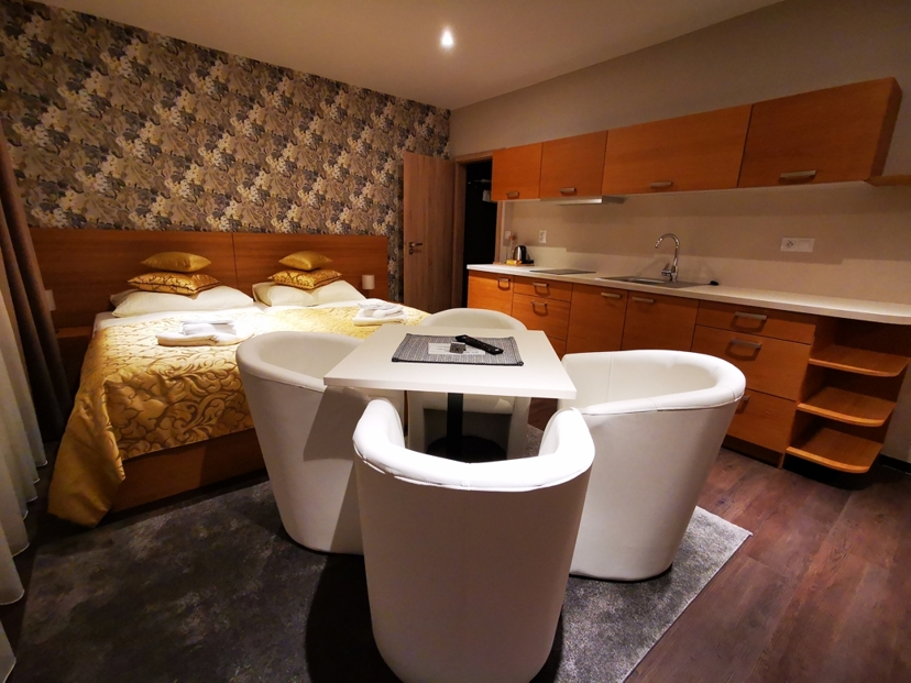 Samoobsluha pomocí zámku. Bezpečnost v místnosti. Vybavený kuchyňský kout s varnou deskou a lednicí. Dětská postýlka, k dispozici na oznámení.