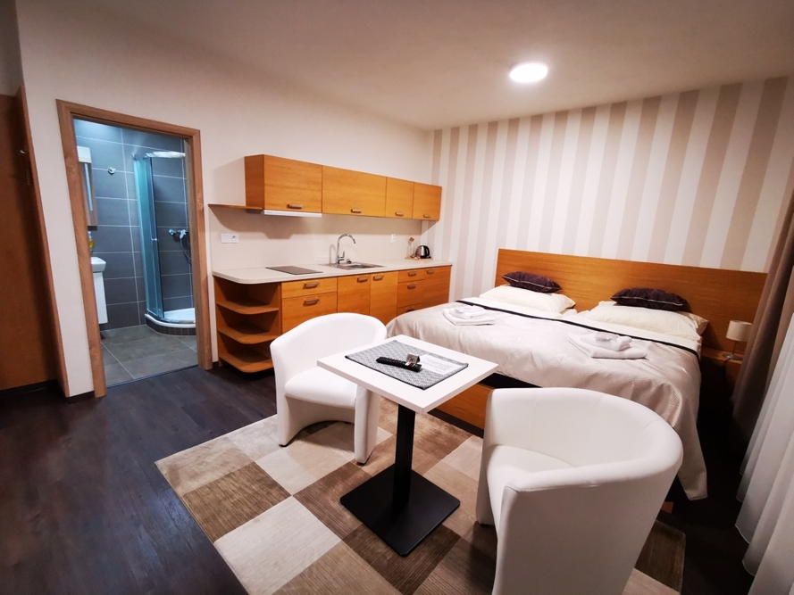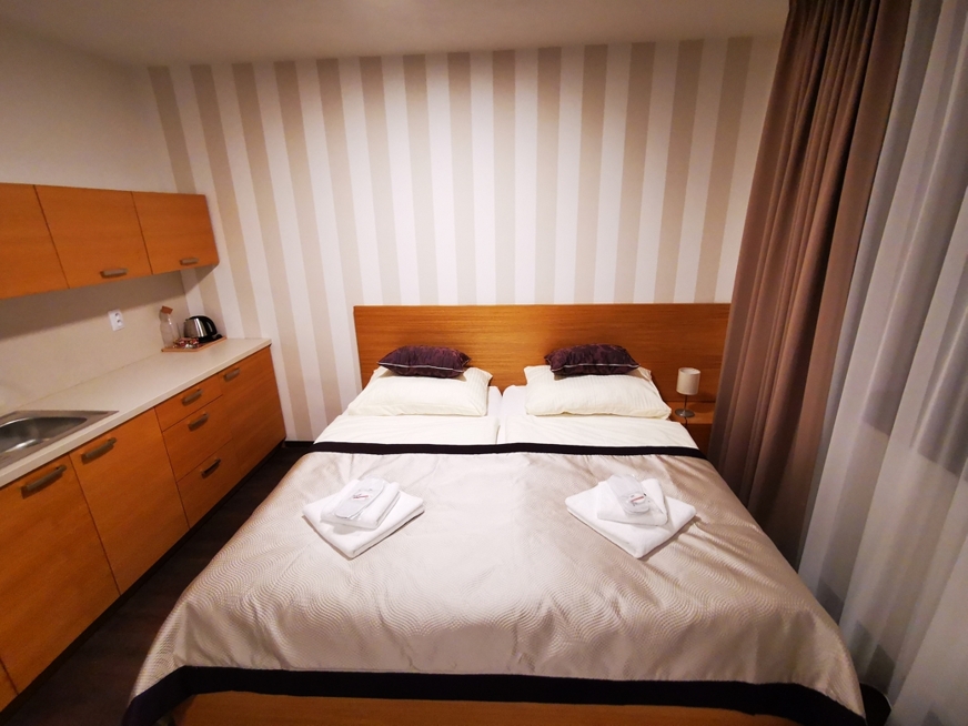 Samoobsluha pomocí zámku. Bezpečnost v místnosti. Vybavený kuchyňský kout s varnou deskou a lednicí. Dětská postýlka, k dispozici na oznámení.